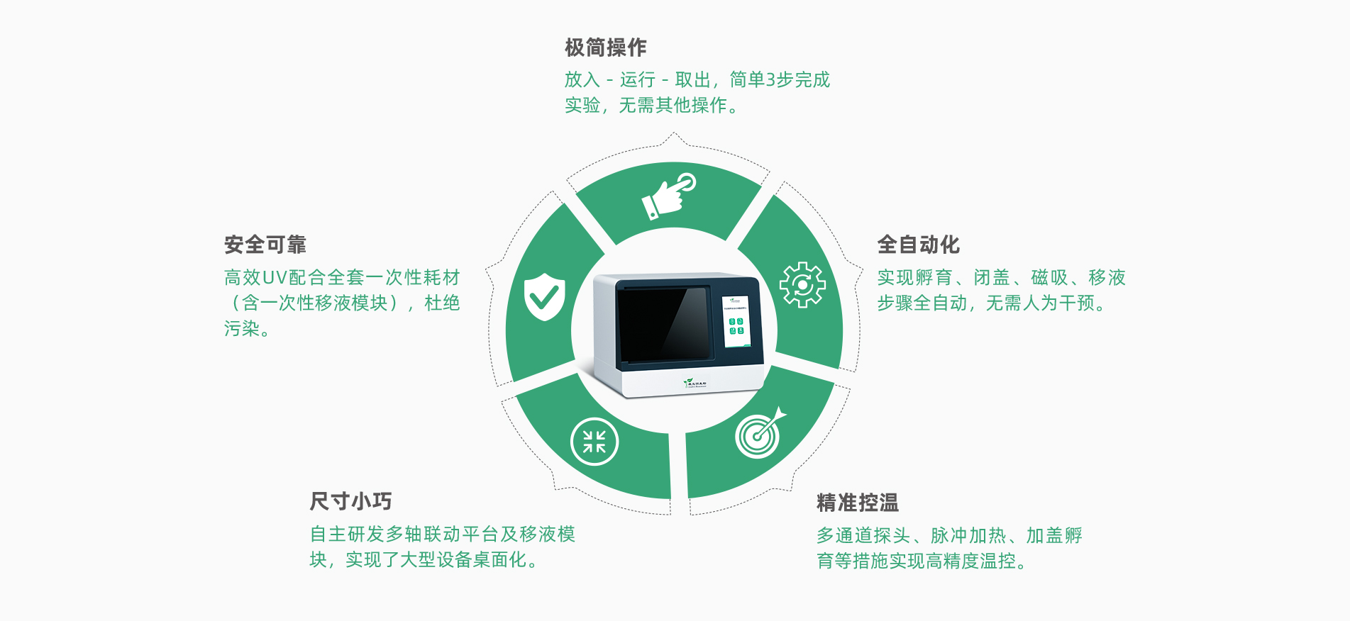 全自動核酸提取儀H24采用了自主研發的移液模塊、孵育模塊,通過磁珠法全自動實現大體積復雜樣本基因組DNA的提取、富集、轉化、純化過程,解決了復雜樣本高質量核酸自動化提取轉化難題。設備采用多軸聯動的自動化平臺,配合獨創的移液模塊,極大地縮小了移液平臺尺寸,同時提高了設備運轉效率。